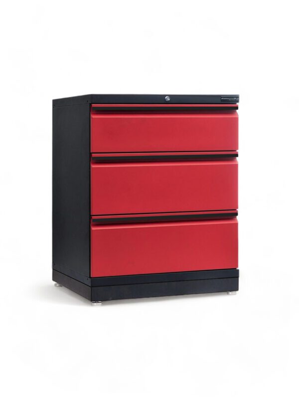 This cabinet with 3 drawers comes fully assembled and lockable with a central locking system for extra security. All drawers have aluminium strips on the handles, ball bearing slides with full extension and black EVA anti-slip mats.